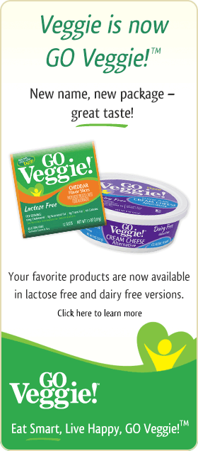 Do you love Veggie cheese alternatives? Veggie is now GO Veggie!™ It’s the incredibly delicious cheese flavor you love, now even better! New packaging, better taste, and even more mouthwatering melt. Eat Smart. Be Happy and Get up and GO Veggie!™ at www.GOVeggieFoods.com.