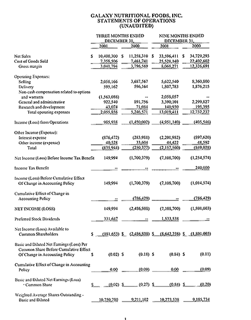 ORLANDO, Florida (Feburary 14, 2002) - Galaxy Nutritional Foods (AMEX:GXY), a leading producer of nutritious plant-based dairy alternatives for the retail and foodservice markets, announced results for its third quarter ended December 31, 2001. The Company reported a net profit before preferred stock dividends of $149,994 versus a loss of $2,486,808 for the comparable quarter one year ago. After deducting preferred stock dividends from the Company's net income, the loss per common share for the quarter was $(0.02) versus a loss of $(0.27). Operating income for the quarter ended December 31, 2001 was $985,938 compared to an operating loss of $1,450,002 for the same period one year ago.
